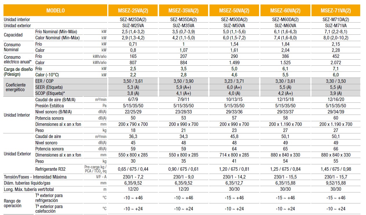 de tubería utilizada para cálculo de capacidad en condiciones nominales: 5m. | Control de condensación incorporado en todas las unidades. |Para las exteriores SUZ se requiere la guía de protección de viento opcional para el modo refrigeración cuando la