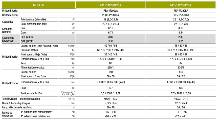 Aire acondicionado tipo Conductos Alta Presión Trifásico, Inverter , Clase A/A, Marca MITSUBISHI ELECTRIC Modelo SPEZ-M200LYKA Serie Standard Inverter . Capacidad frigorífica 16340 fg/h.; Capacidad calorífica 19260 Kcal/h. Ideal para estancias de más de 105 m2
